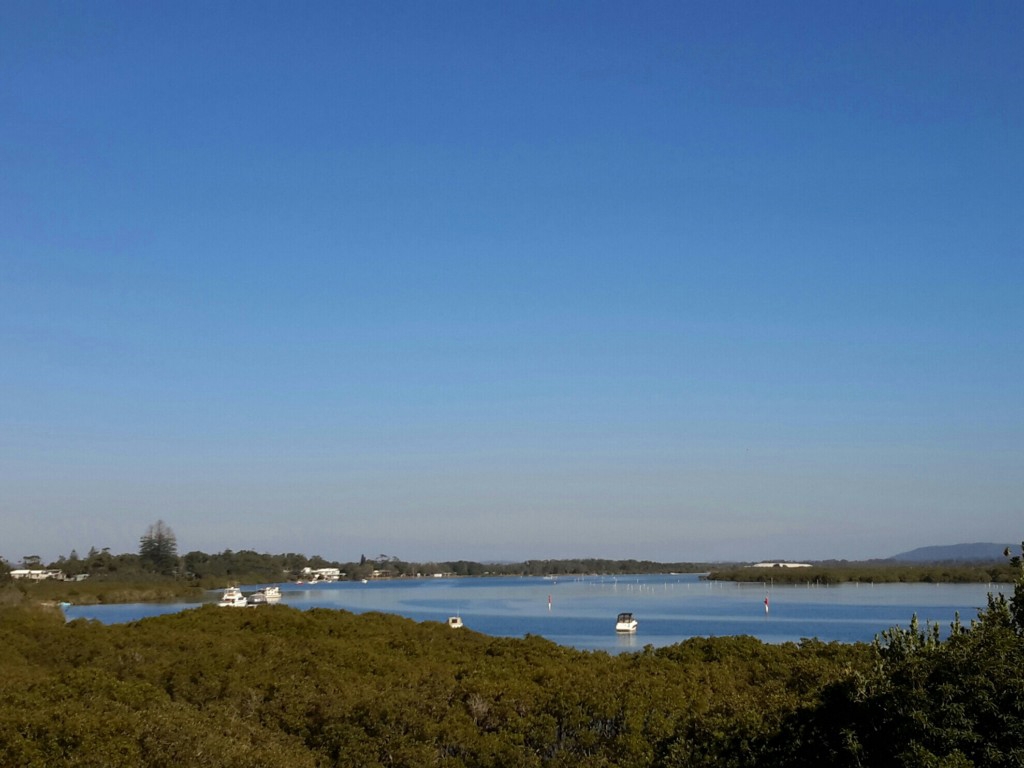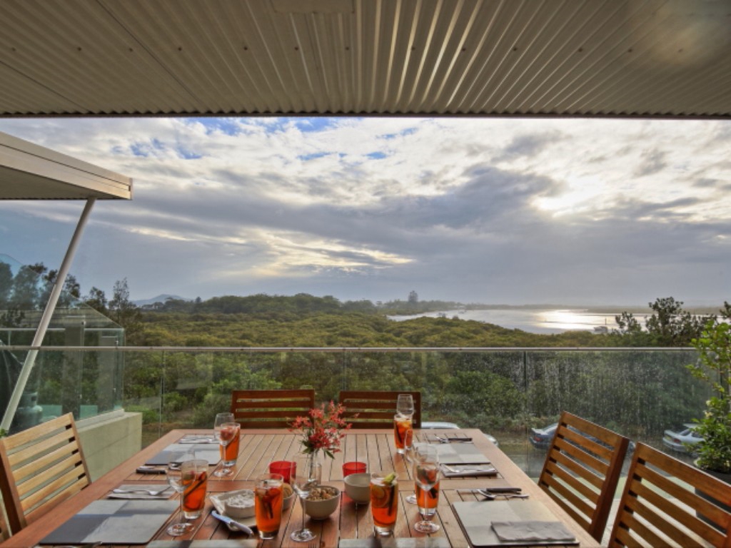 SLEEPS 10. `Majestic Views’. Executive style four bedroom, 3 bathroom townhouse with sweeping, uninterrupted water views of the Myall River. Located on the riverfront only metres from the boat ramp, minutes to Jimmys and Bennetts beaches, the Hawks Nest golf course, cafes, restaurants, clubs and shops. Beautifully furnished with quality inclusions.