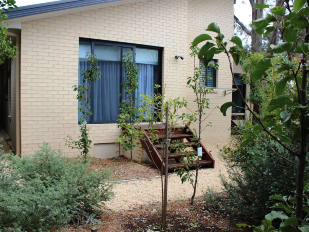 Queen bed with ensuite and walk-in robe. Glass sliding door open on to small deck and stairs to back courtyard area. Television on wall.