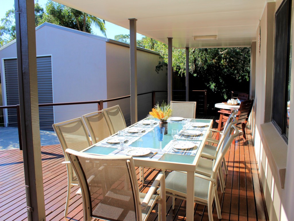 Large covered timber patio with bbq and outdoor setting. Pet Friendly.