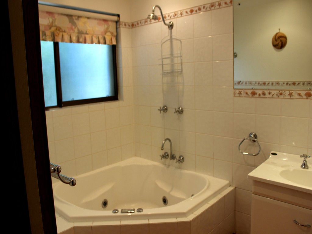 Spa bath, shower, vanity and separate toilet