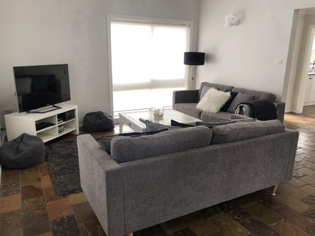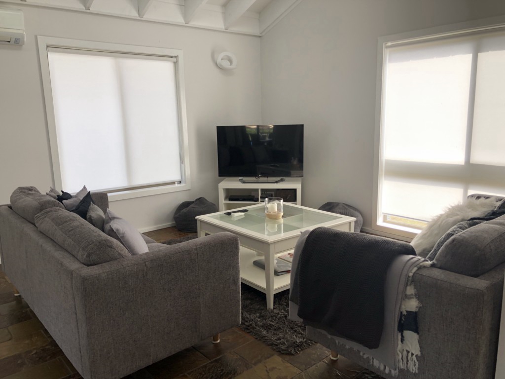 Large, sunny, open area includes 2x 3 seater lounges, air-conditioning, television with built-in dvd player. Diniing table.
