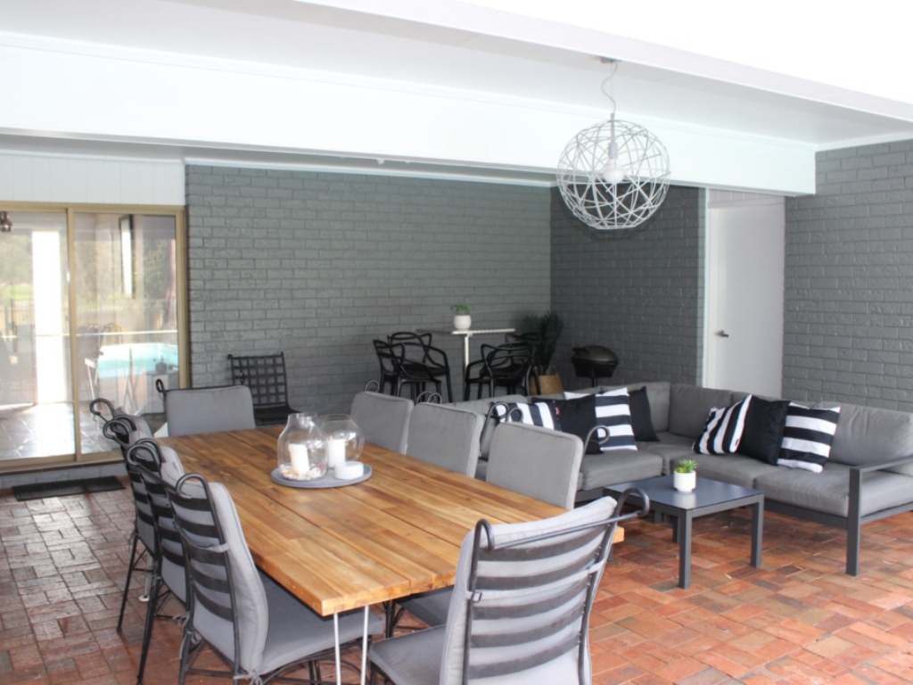 Undercover entertaining area looking out to pool.