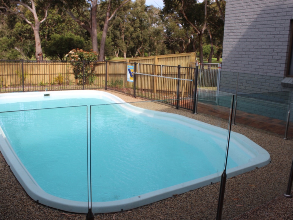 Swimming pool with complete safety fencing looking to golf course.